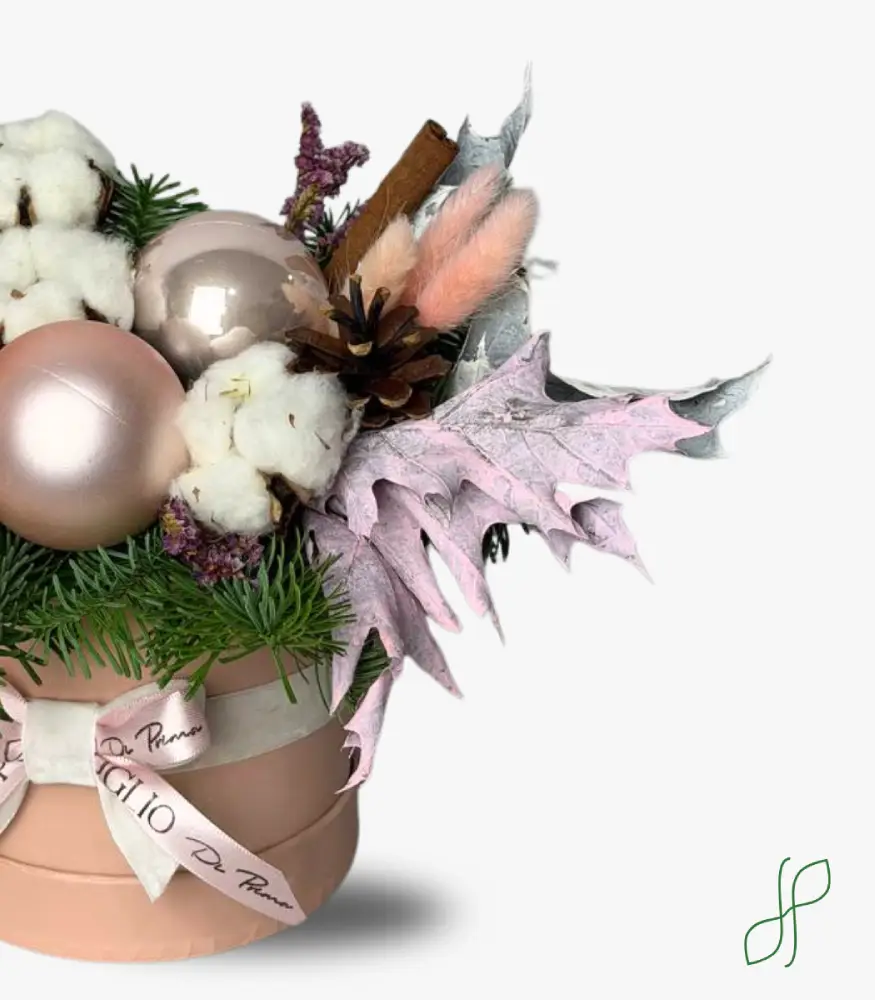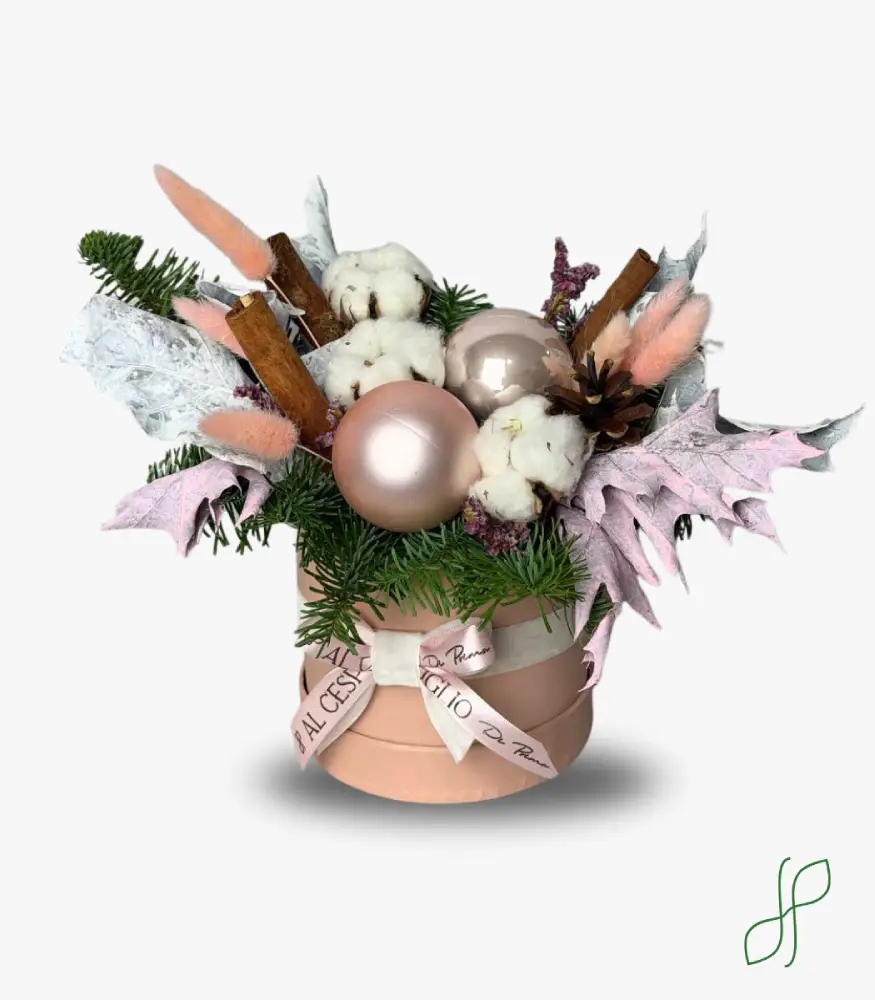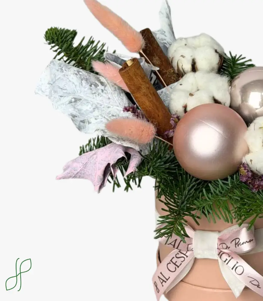 Composizione Natalizia Rosa con Stecche di cannella, abete, sfere natalizie, bacca di cotone, pigna, lagurus rosa, foglie di quercia bianche e rosa
