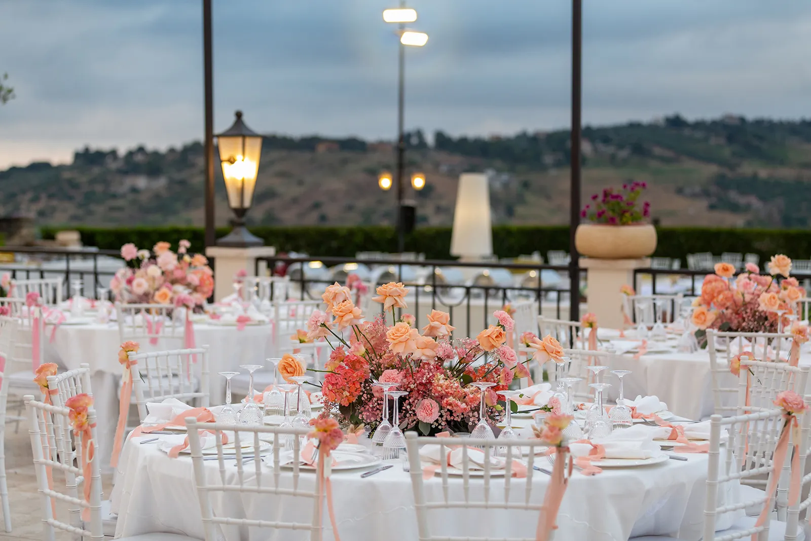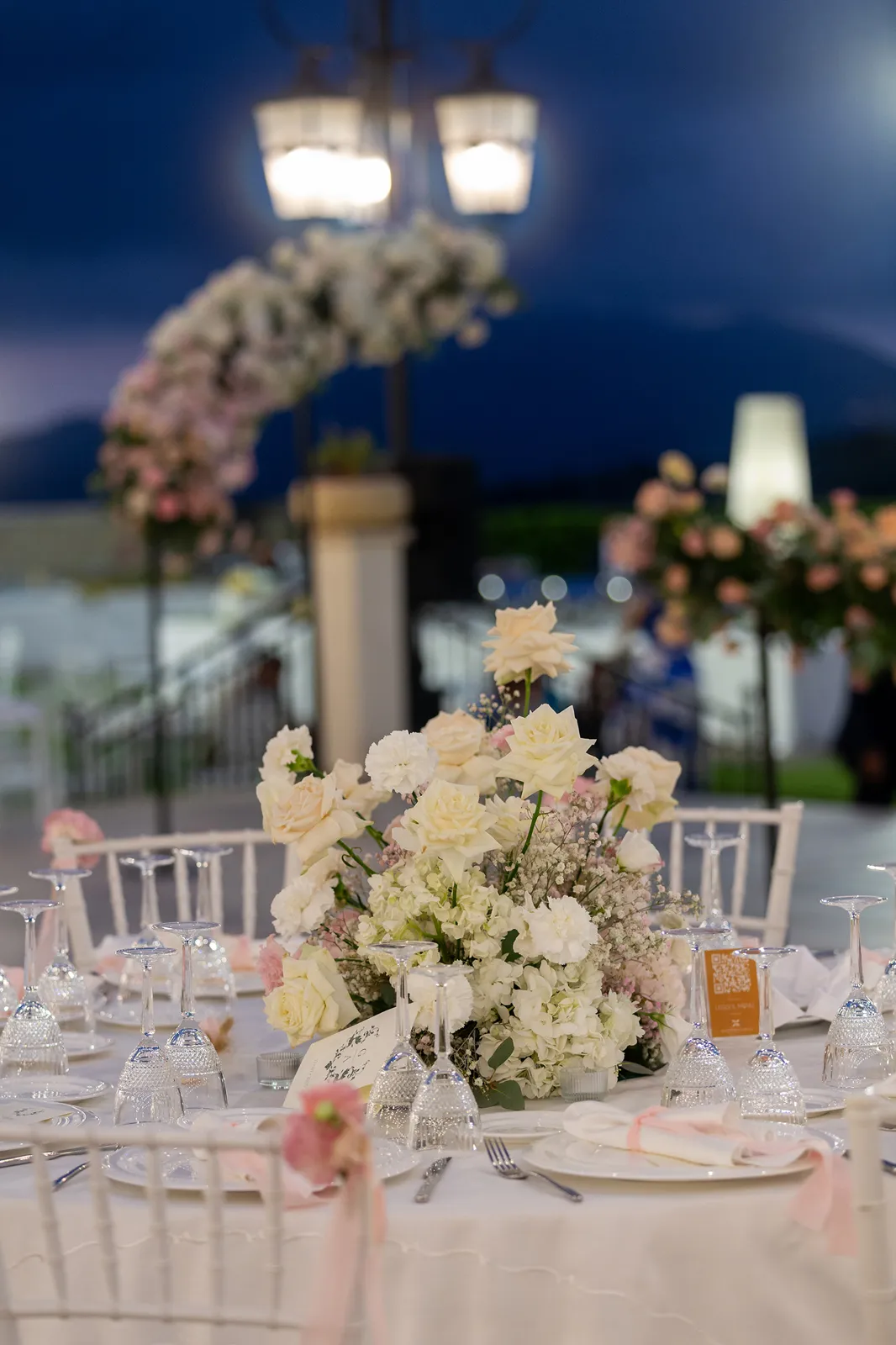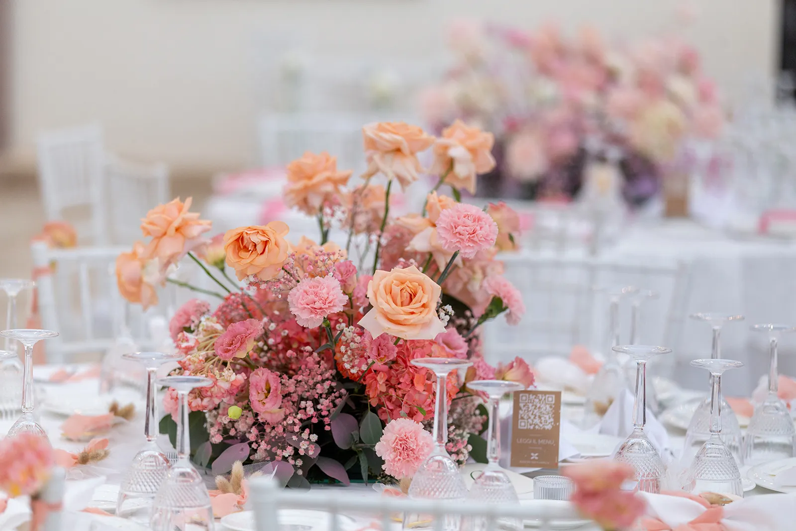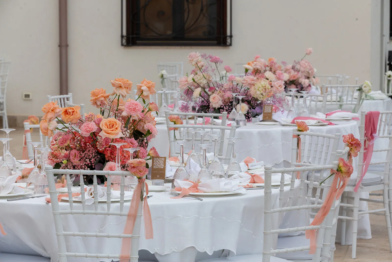 Il progetto floreale per il matrimonio di Alessandro e Gaia si sviluppa attraverso una delicata gradazione cromatica che parte dal bianco puro, evolve verso tenui sfumature rosa e ritorna nuovamente al candore iniziale, creando un racconto visivo di eleganza e romanticismo.