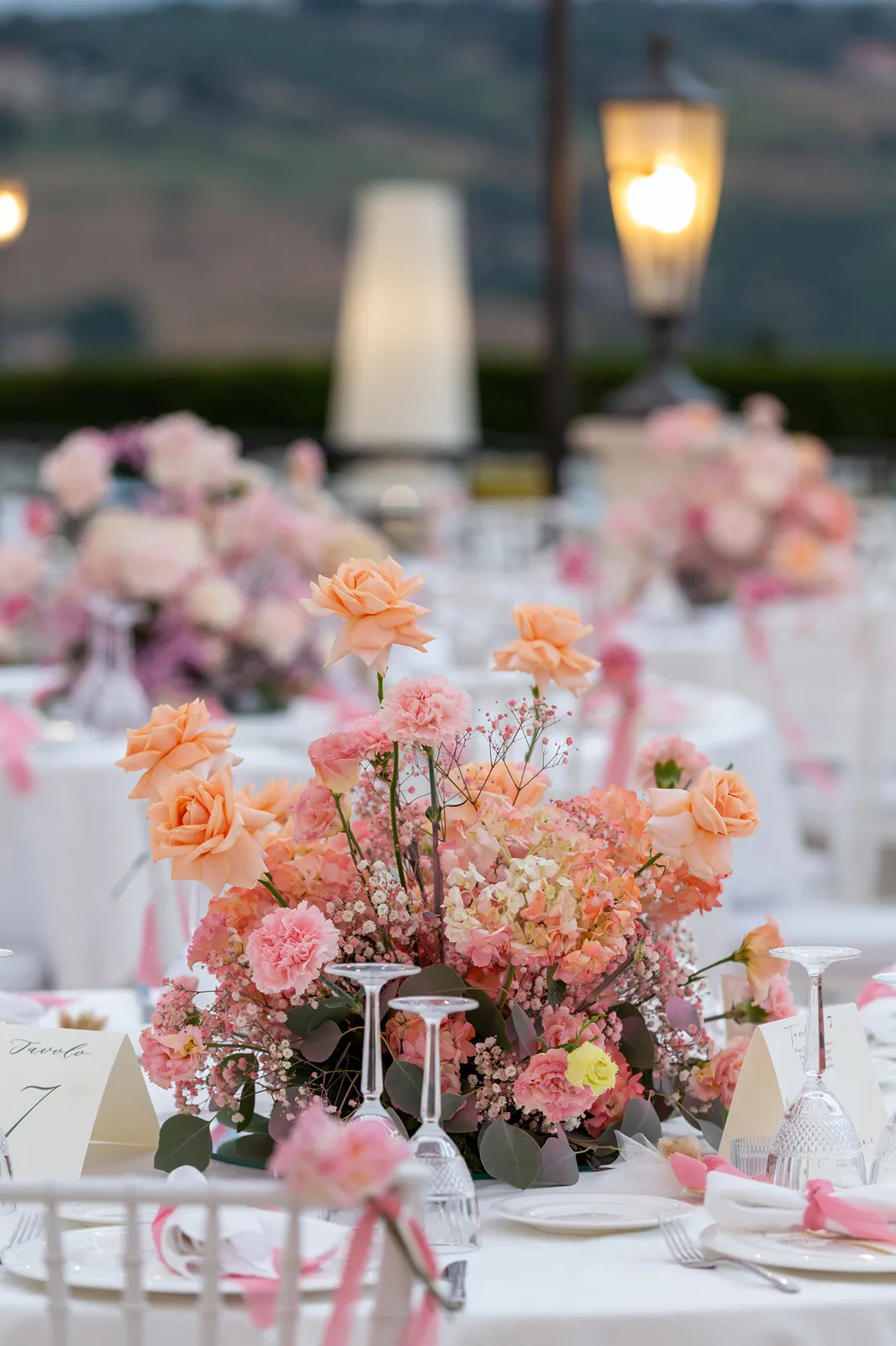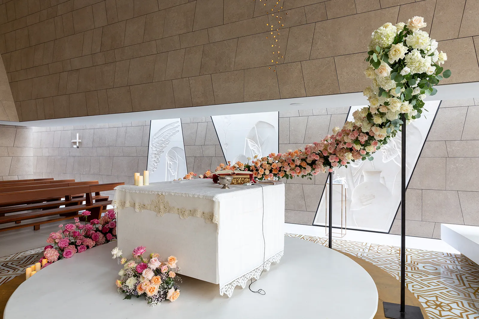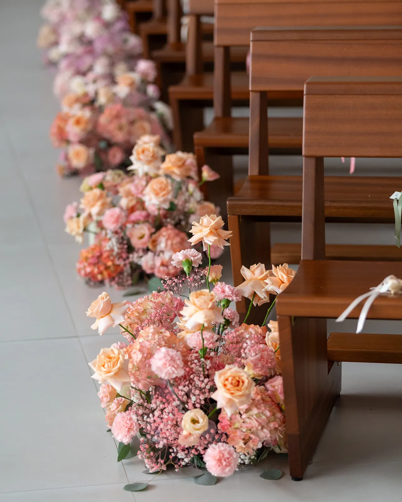 Le composizioni sono realizzate con rose bianche e rosa antico, ortensie dalle sfumature polvere e lysianthus che sfumano dal bianco al rosa pallido. Questa transizione cromatica accompagna gli sposi lungo tutto il percorso della cerimonia: dall'ingresso in chiesa con composizioni bianche che simboleggiano la purezza, al momento centrale dove il rosa rappresenta l'amore che sboccia, fino al finale dove il ritorno al bianco celebra l'unione perfetta.