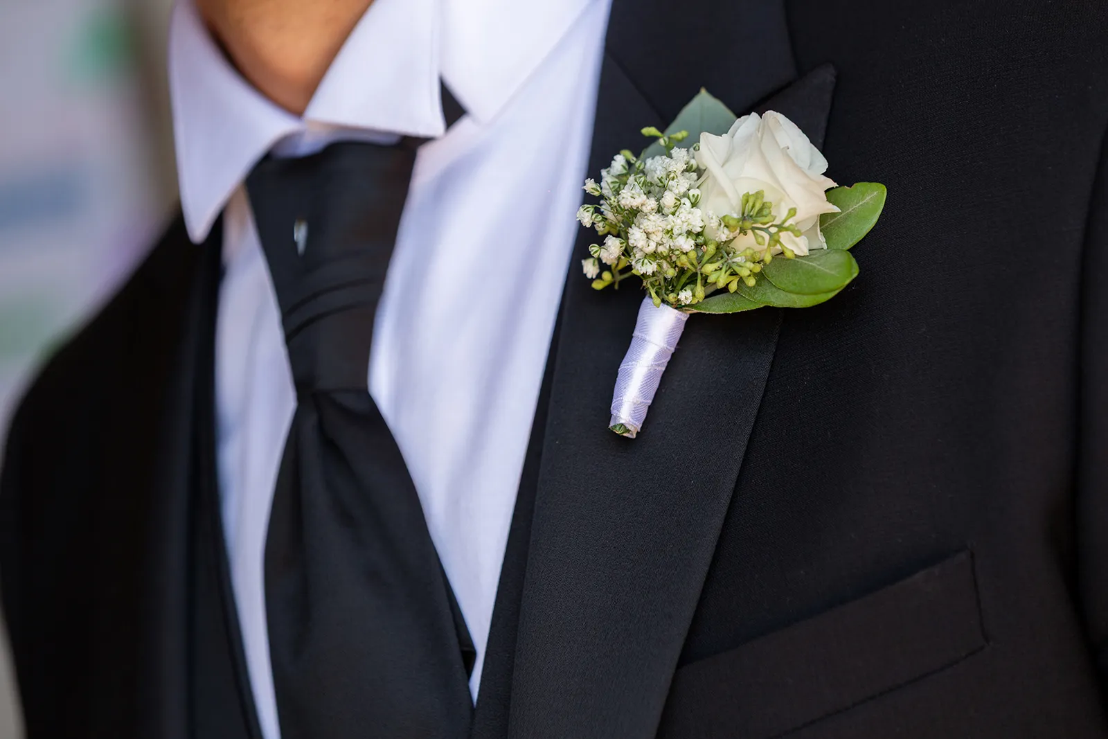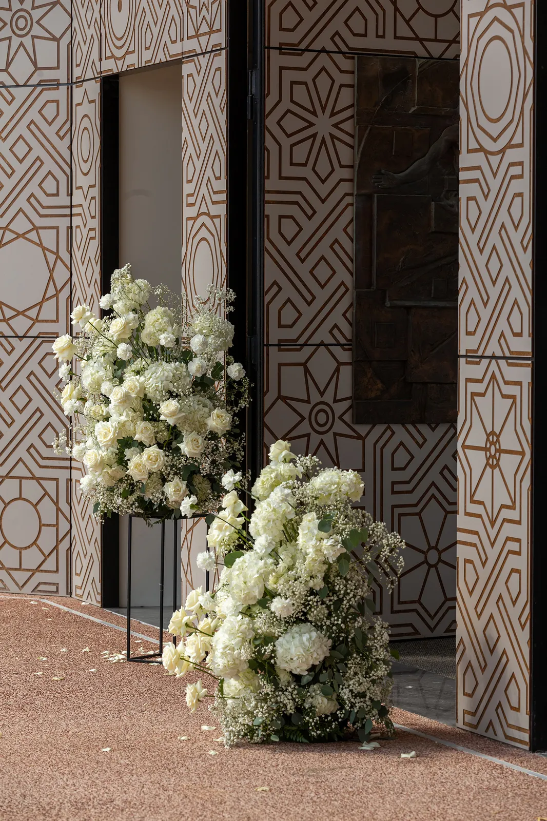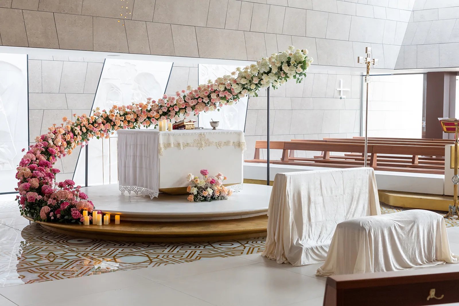 Le composizioni sono realizzate con rose bianche e rosa antico, ortensie dalle sfumature polvere e lysianthus che sfumano dal bianco al rosa pallido. Questa transizione cromatica accompagna gli sposi lungo tutto il percorso della cerimonia: dall'ingresso in chiesa con composizioni bianche che simboleggiano la purezza, al momento centrale dove il rosa rappresenta l'amore che sboccia, fino al finale dove il ritorno al bianco celebra l'unione perfetta.